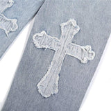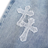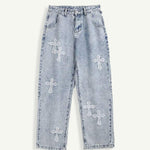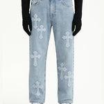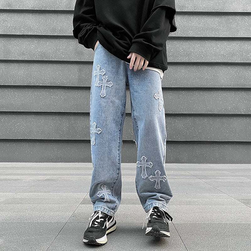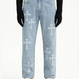 Ajoutez de la couleur à votre look avec nos jean bleu avec croix. Notre collection de denim de qualité est ornée de croix uniques et audacieuses, offrant une touche streetwear et Y2K.