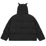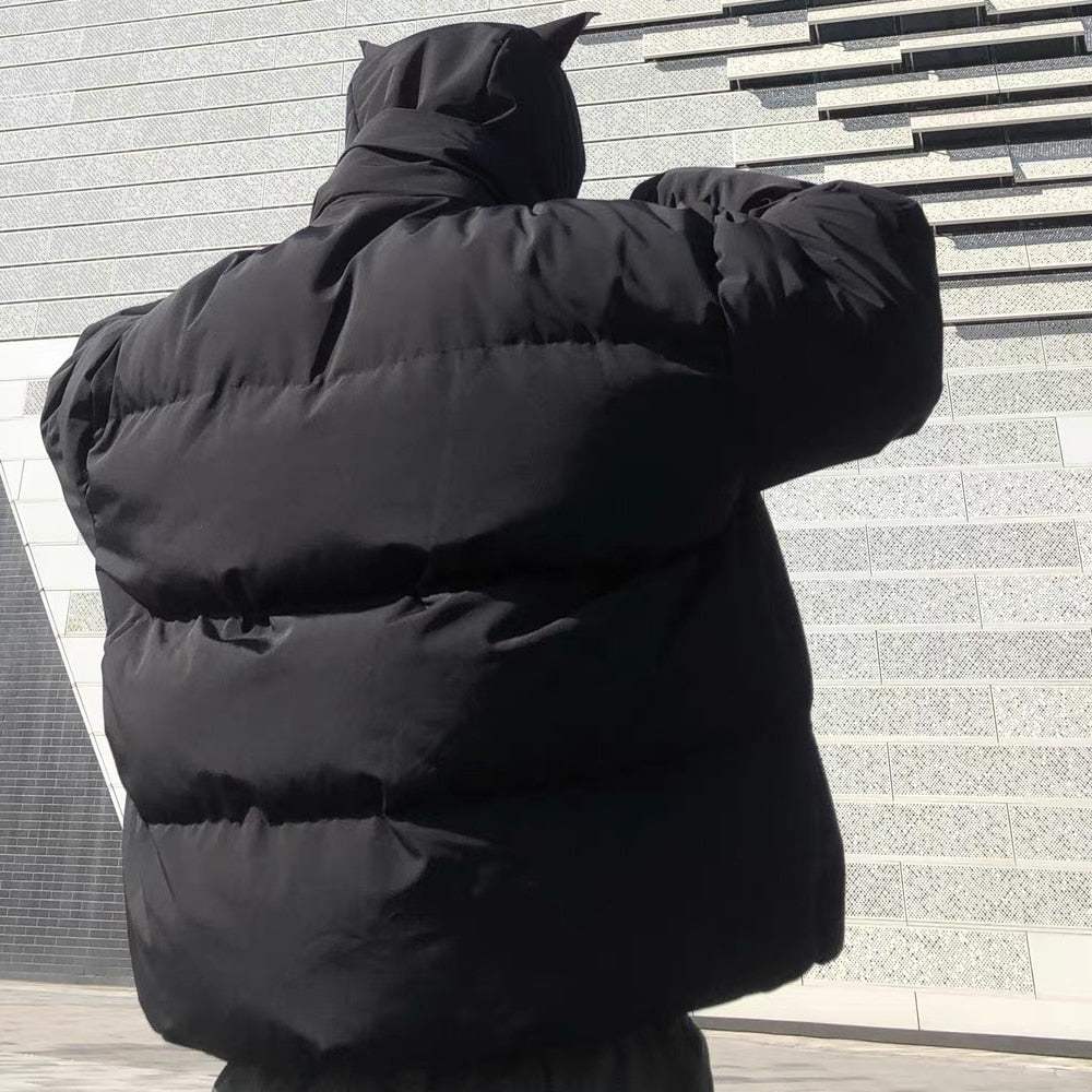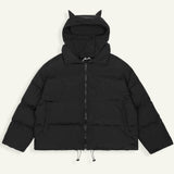 La doudoune avec corne est la pièce parfaite pour affirmer ton style cet hiver. Avec sa capuche ornée de cornes, elle apporte une touche rebelle et unique à ton look. Inspirée de l'esthétique Y2K streetwear, elle combine confort, originalité et protection contre le froid.