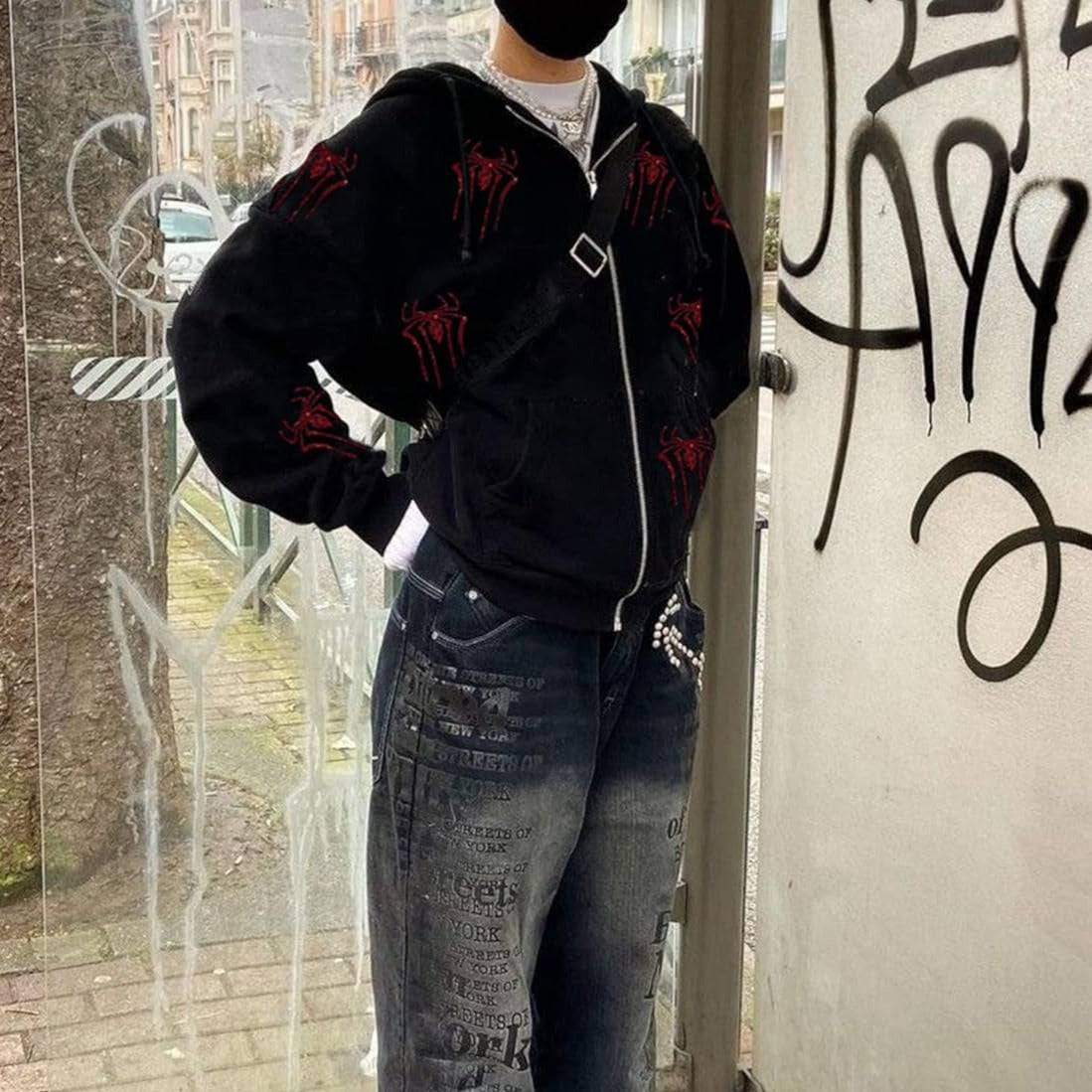 Ce hoodie Spiderman à capuche zippée est inspiré de l’esthétique Y2K et complète facilement un outfit décontracté ou audacieux. Son style travaillé, ses coutures soignées et son imprimé graphique en font une spiderman jacket Y2K unique en son genre.